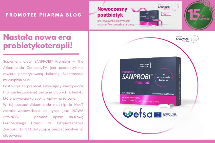 Suplement diety SANPROBI® Premium – The Akkermansia CompanyTM jest postbiotykiem, zawiera pasteryzowaną bakterię Akkermansia muciniphila MucT.