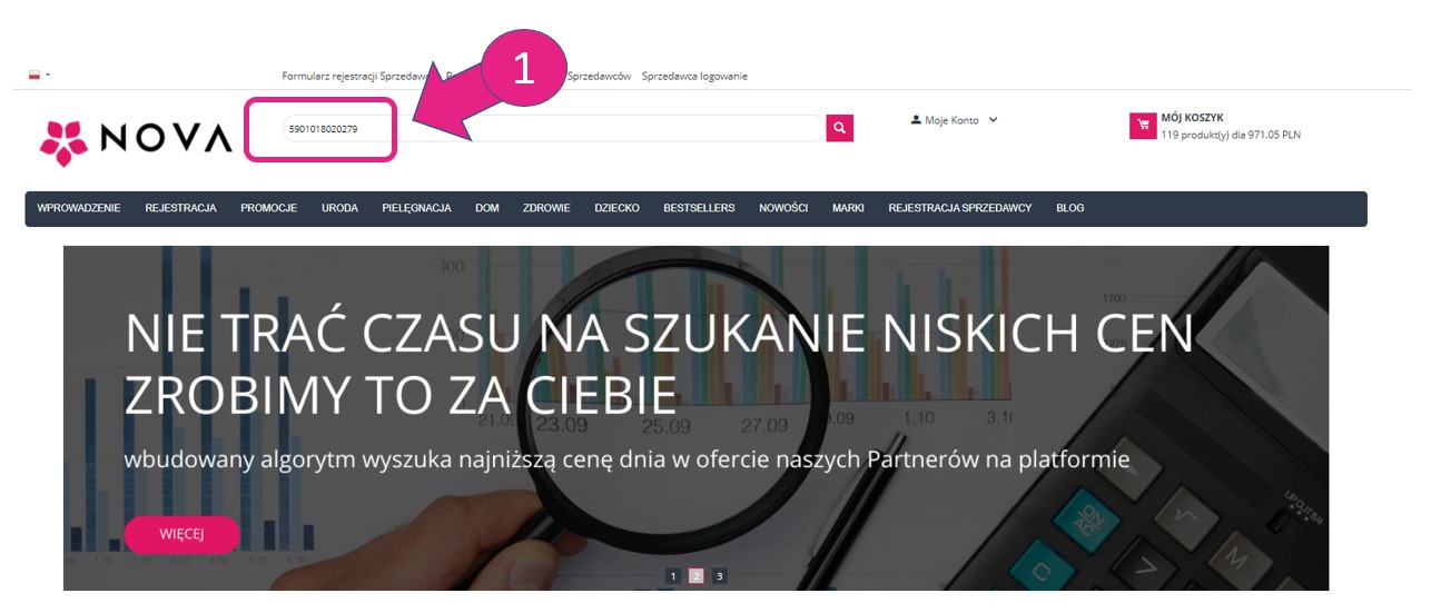 KROK 1 - wpisz dane szukanego produktu (np. EAN) w pole wyszukiwarki na głównej stronie i zatwierdź klikając >ENTER<